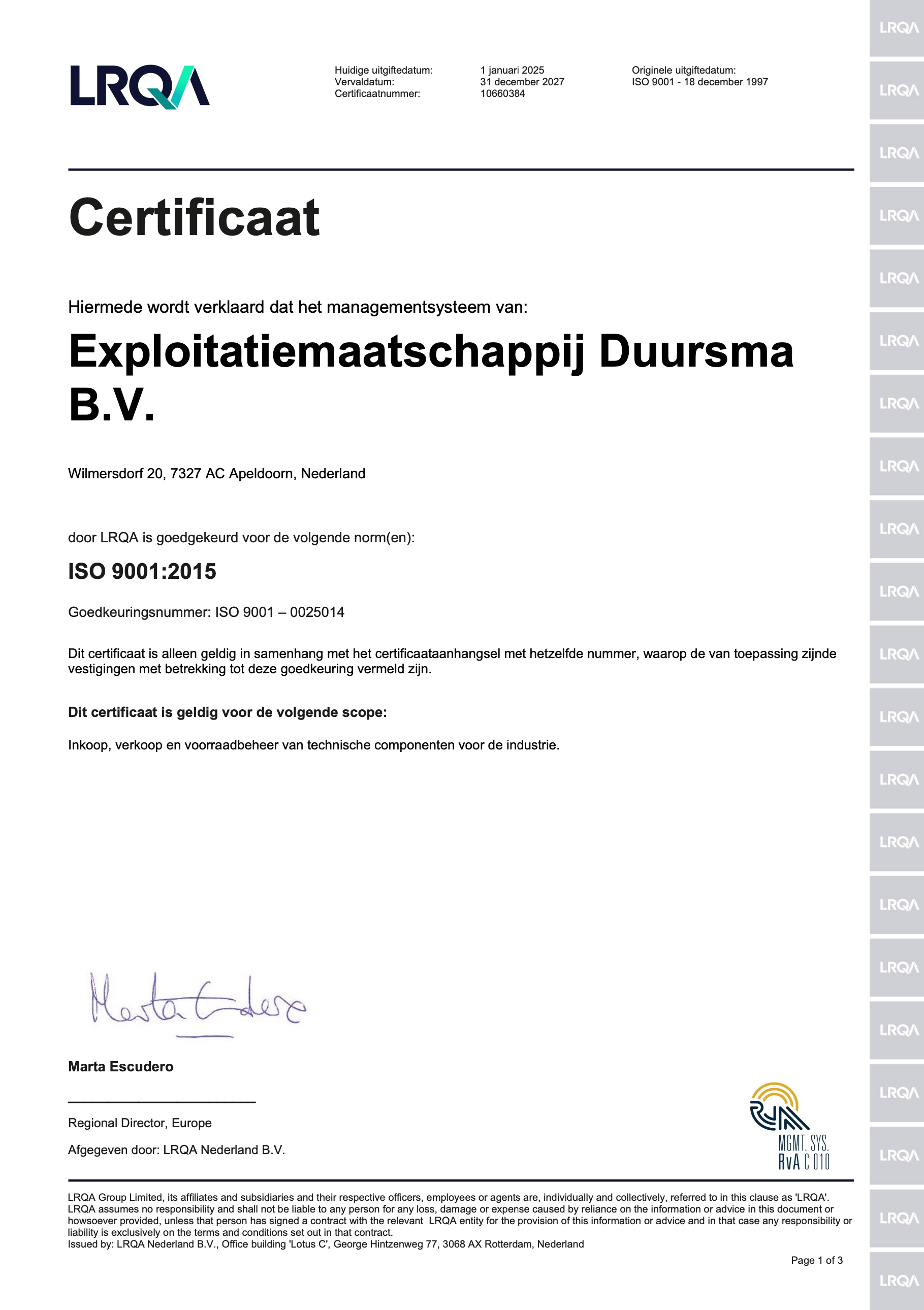 Jaarlijks worden er bij Duursma door Lloyd’s audits gehouden, waarbij sinds 1997 het certificaat ieder jaar met succes is verlengd. Wij zijn dan ook volgens de allernieuwste norm gecertificeerd: ISO 9001-2015.